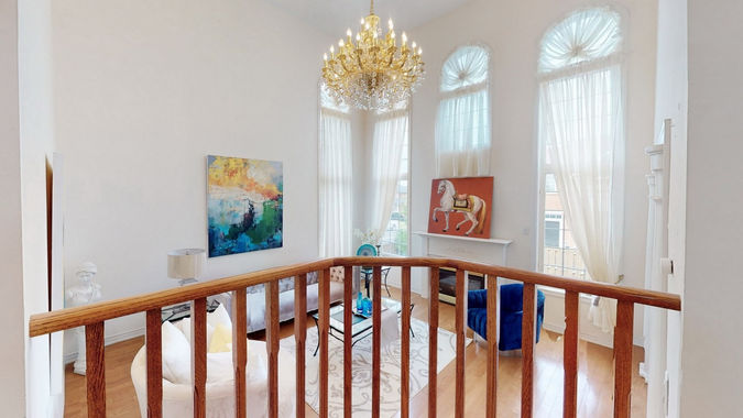 Step into a stunning high-ceiling home that exudes traditional charm and timeless elegance. The bright white interiors create a pristine canvas, beautifully complemented by classic columns and stunning glass chandeliers that cast a warm, shimmering glow. Airy, sweeping curtains drape gracefully, adding a sense of lightness and movement to the space. Subtle pops of colour infuse the home with a touch of vibrancy, enhancing its serene and sophisticated atmosphere. This residence masterfully combines grandeur with comfort, offering character-filled charm.